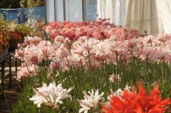 ネリネの花の魅力はなんといっても光が当たると、ラメをちりばめたようにきらきらとした輝きです。朝日の当たった花は見とれて時間がたつのを忘れてしまいます。